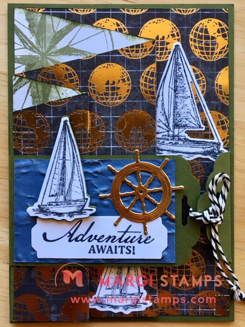 The World of Good DSP is a standout. You can see Misty Moonlight works with Black, Mossy Meadow and brass. You might also notice the embossed Misty Moonlight Paper. The Old World Paper 3D embossing folder certainly gives that old world paper feel.