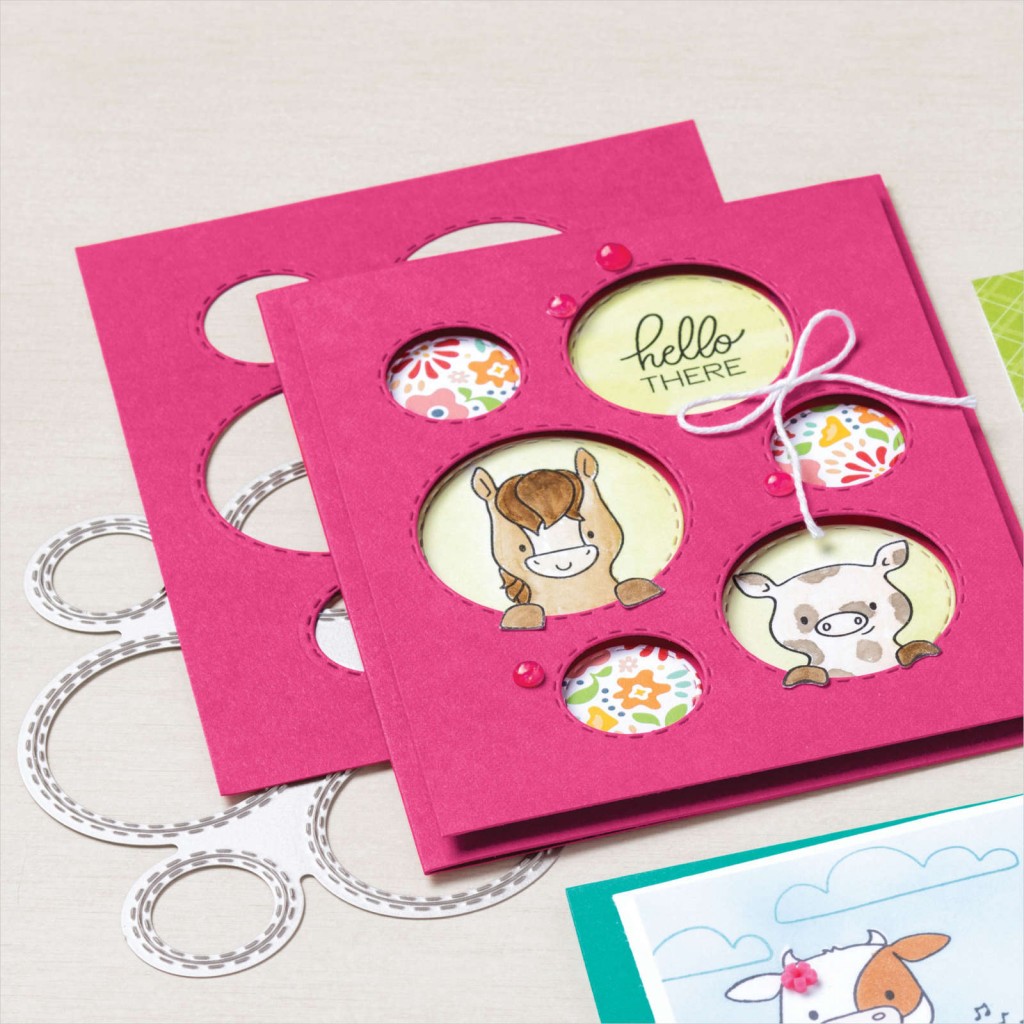 Stripes of In the Wild Designer Series Paper are ‘woven’ to create the jungle background while a Layering Circle of embossed Crushed Curry cardstock frames the die-cut Wild Cat. We used Animal Print Embossing Folder to emboss Crushed Curry Cardstock.