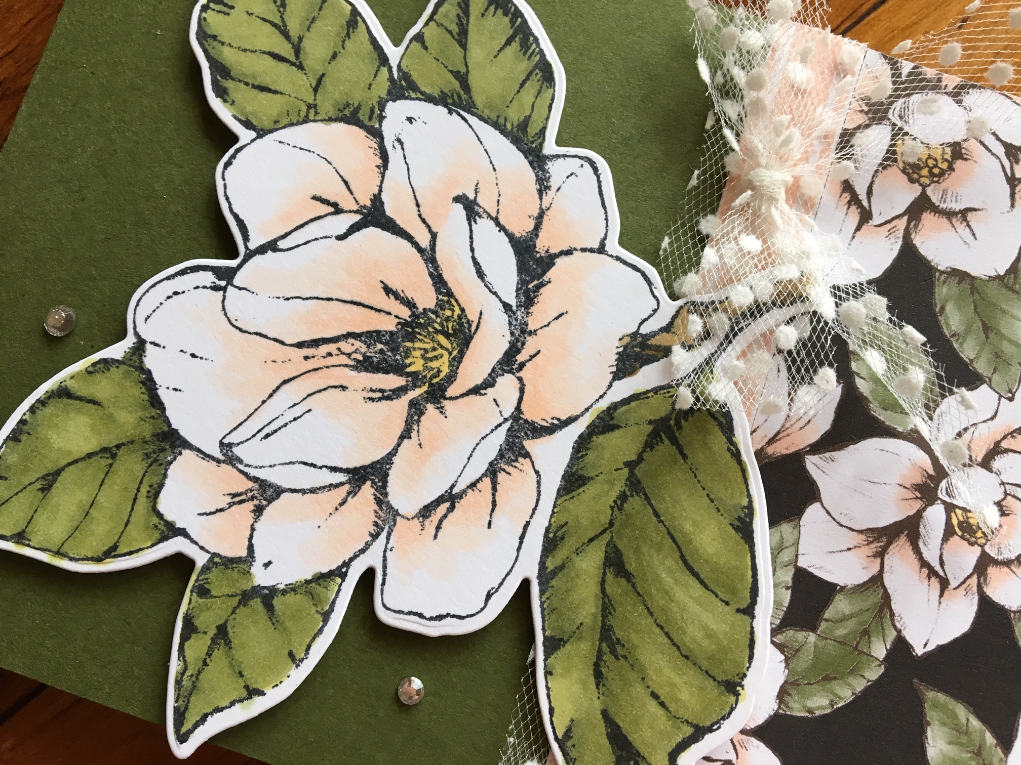 There are two offerings; the first Magnolia Lane Suite (AC p37-39) and a beginner stamp set Magnolia Blooms ($24.00). This is a simpler stamp set designed for the beginner stamper. Both offerings are beautiful and co-ordinate with all the products the suite. The greetings share the same font.